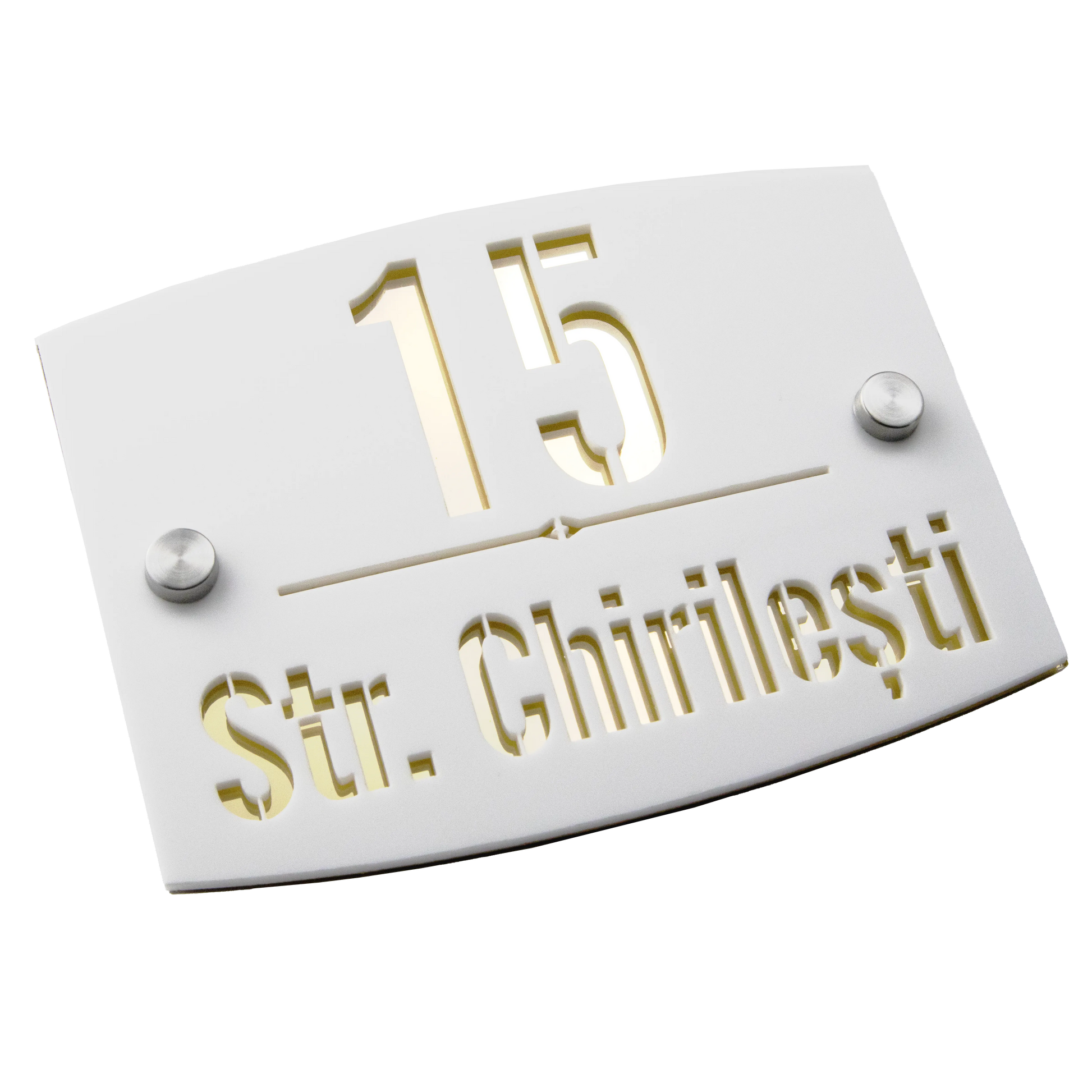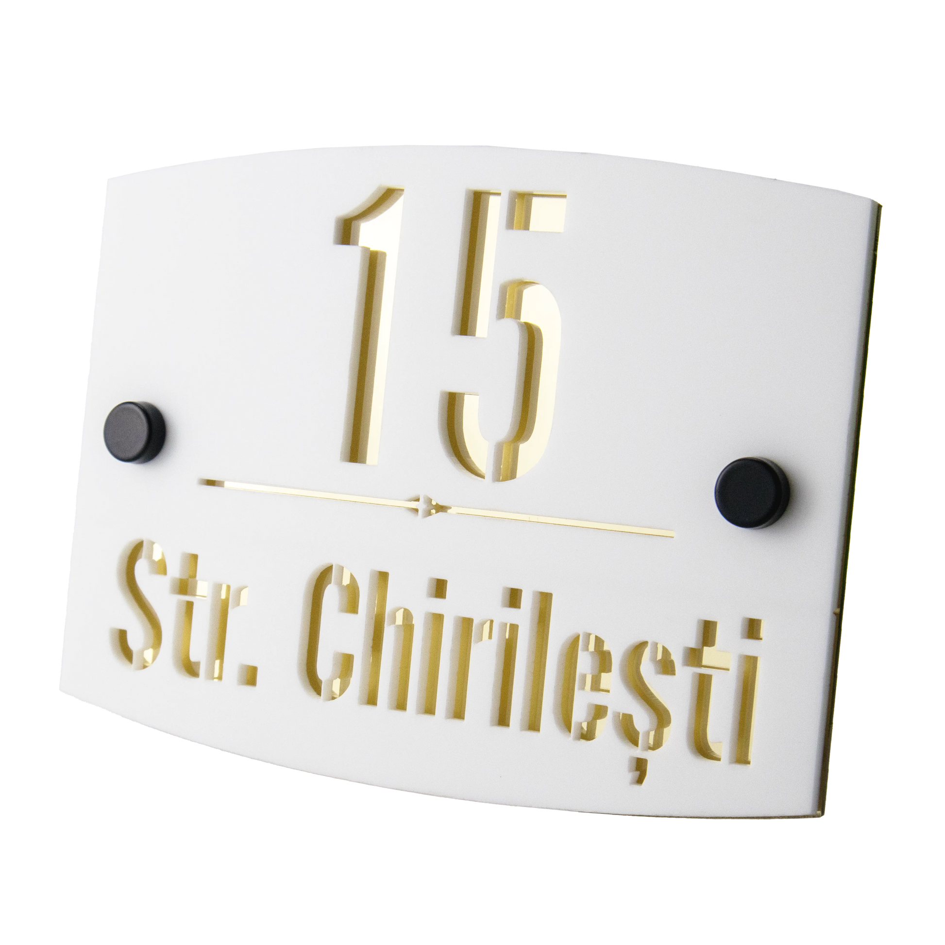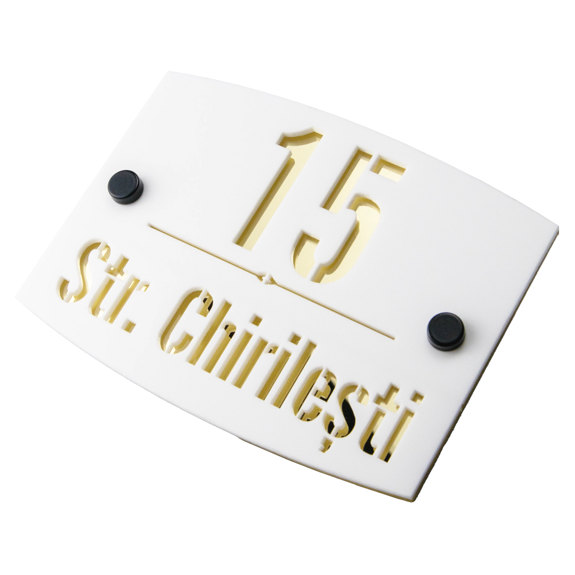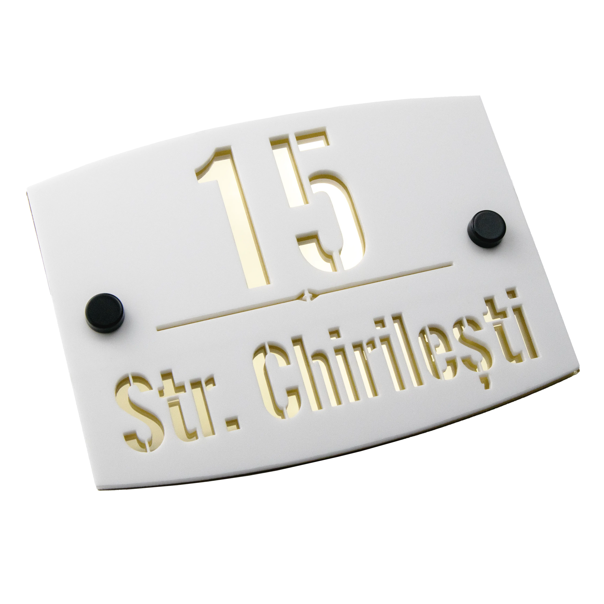 Adauga o nota de rafinament casei tale cu Numarul de casa Arcadia 16x12cm – Alb/Auriu Oglinda.