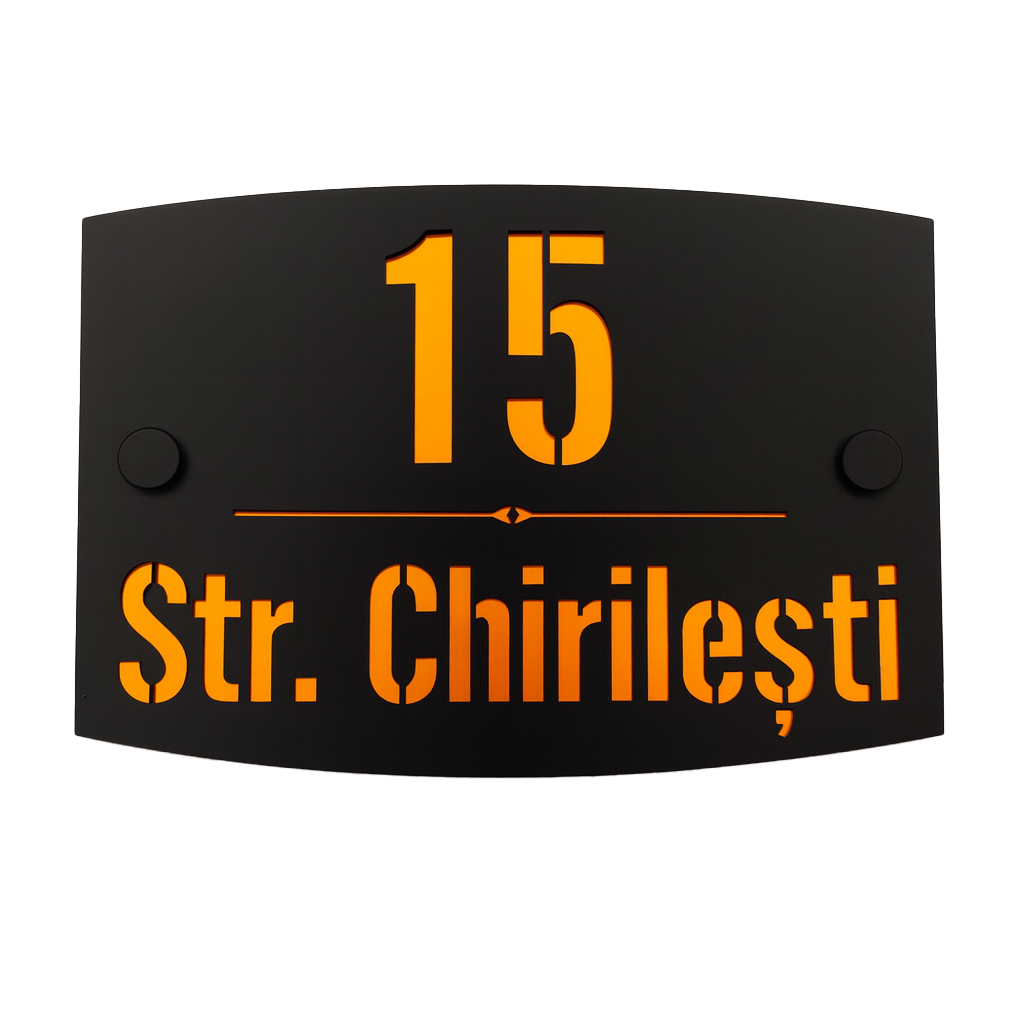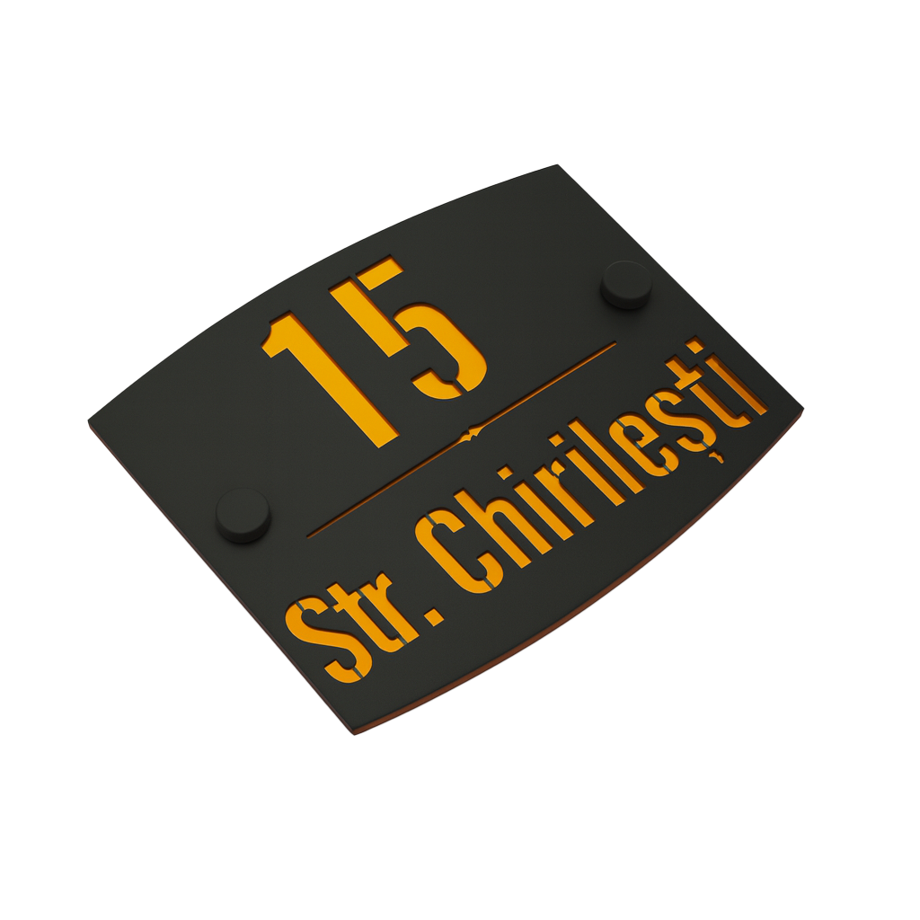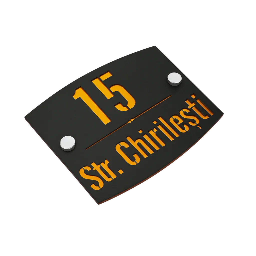 Fabricată din acril rezistent, plăcuța are un finisaj elegant și un contrast puternic între stratul frontal negru și fundalul Amber Oglindă. Această combinație de culori asigură lizibilitate chiar și de la distanță și creează un efect vizual sofisticat, care completează perfect fațada casei tale. Produsul este conceput pentru a rezista la condiții meteo variate, menținându-și aspectul impecabil de-a lungul timpului.