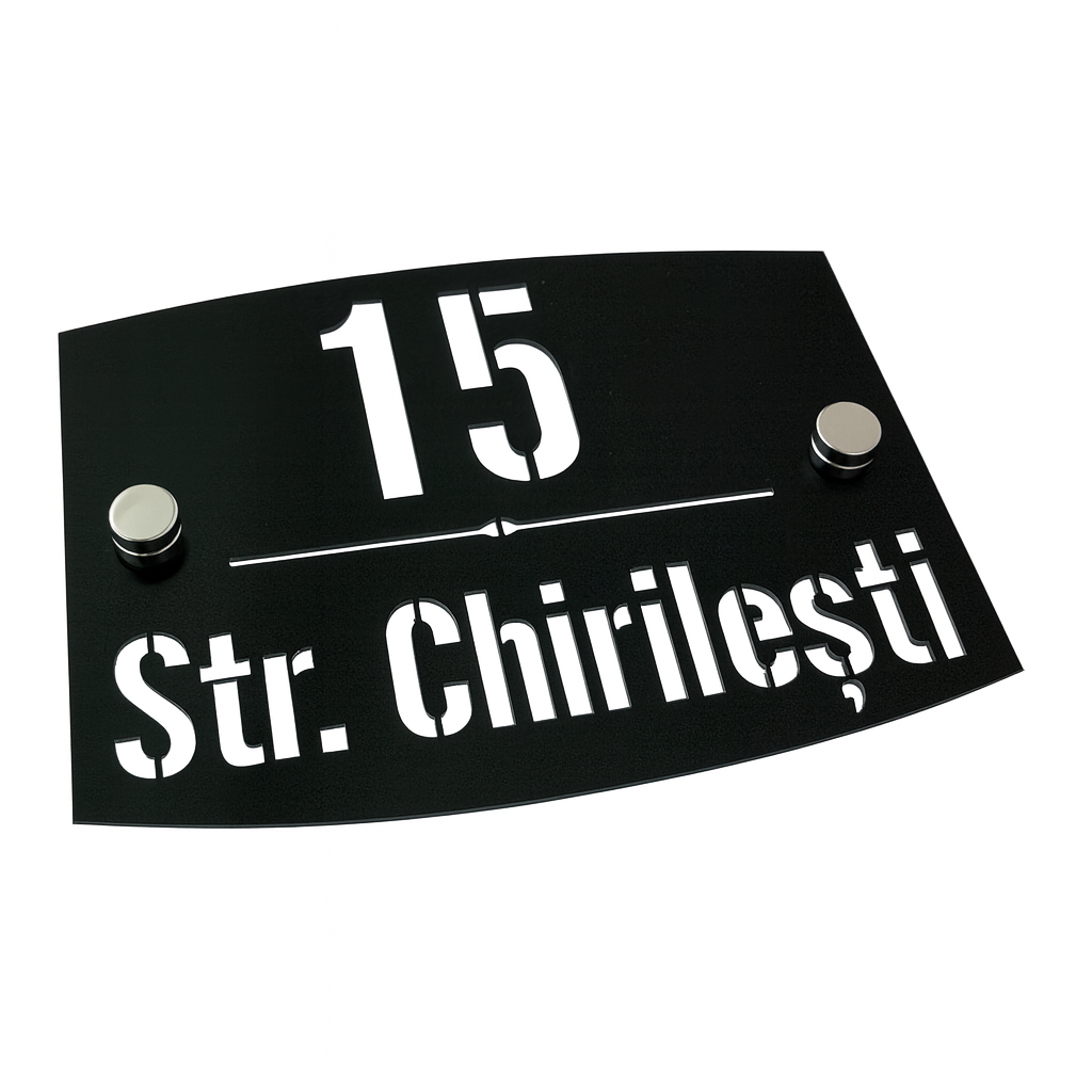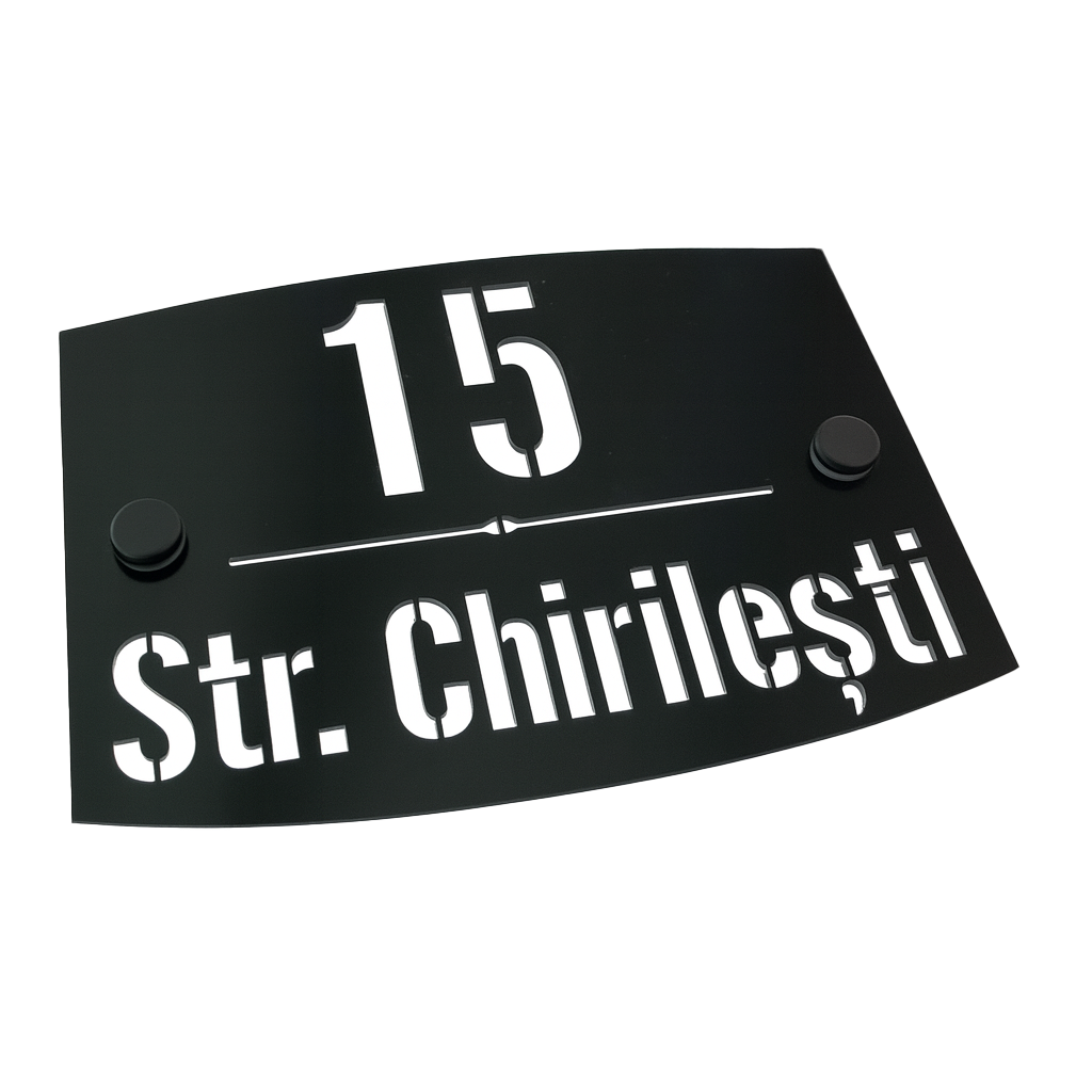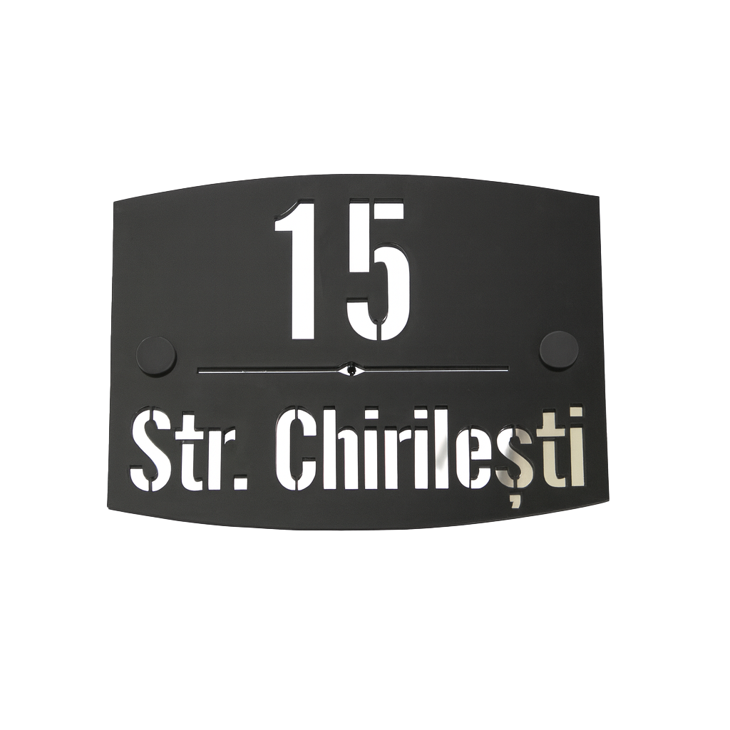 Fabricată din acril rezistent, plăcuța prezintă un contrast rafinat între stratul frontal negru și fundalul argintiu oglindă. Această combinație creează un efect vizual elegant, asigurând lizibilitate chiar și de la distanță. Luciul argintiu adaugă un aer premium, făcând ca numărul casei să fie ușor de remarcat atât ziua, cât și seara.