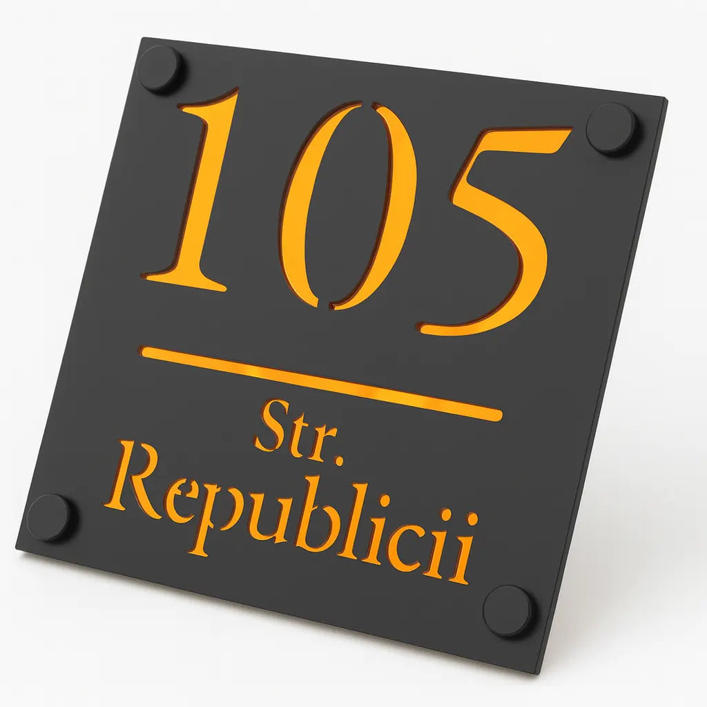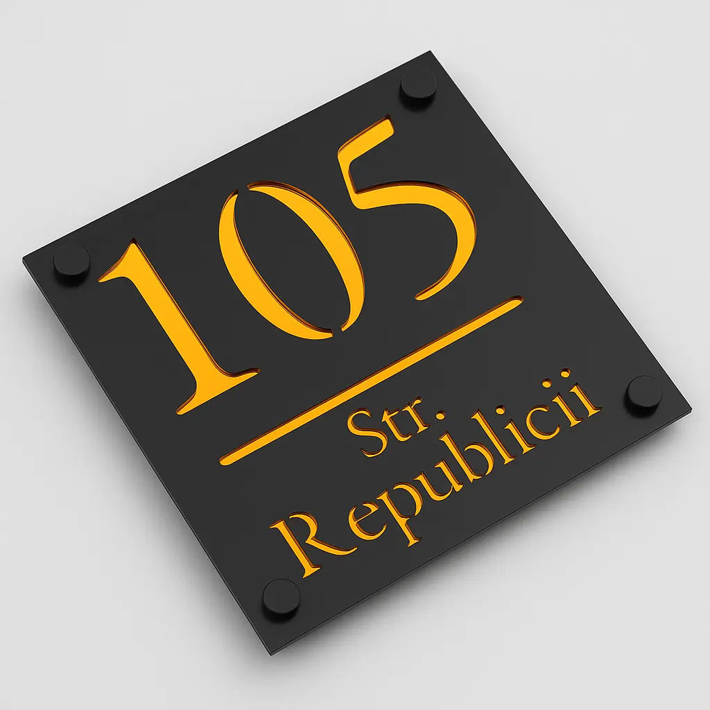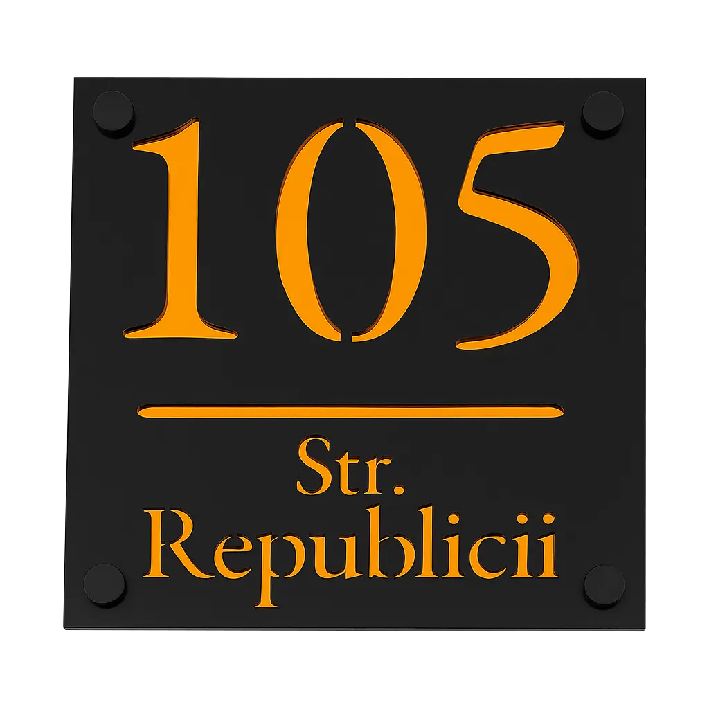 Plăcuța este fabricată din acril rezistent și se remarcă prin contrastul vizual puternic dintre stratul frontal negru și fundalul Amber Oglindă. Această combinație de culori asigură vizibilitate excelentă atât pe timp de zi, cât și seara, oferind un aspect rafinat și atrăgător. Fontul elegant și proporțiile armonioase fac ca acest număr apartament sau număr casă să se integreze perfect în orice decor exterior.