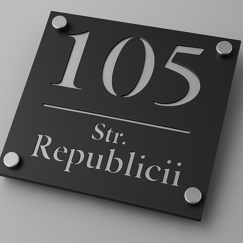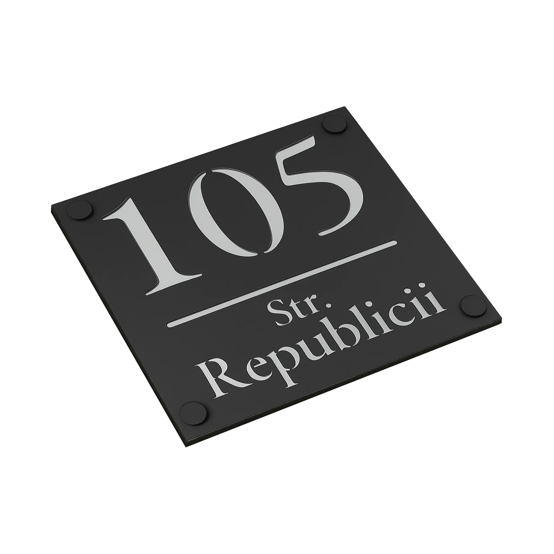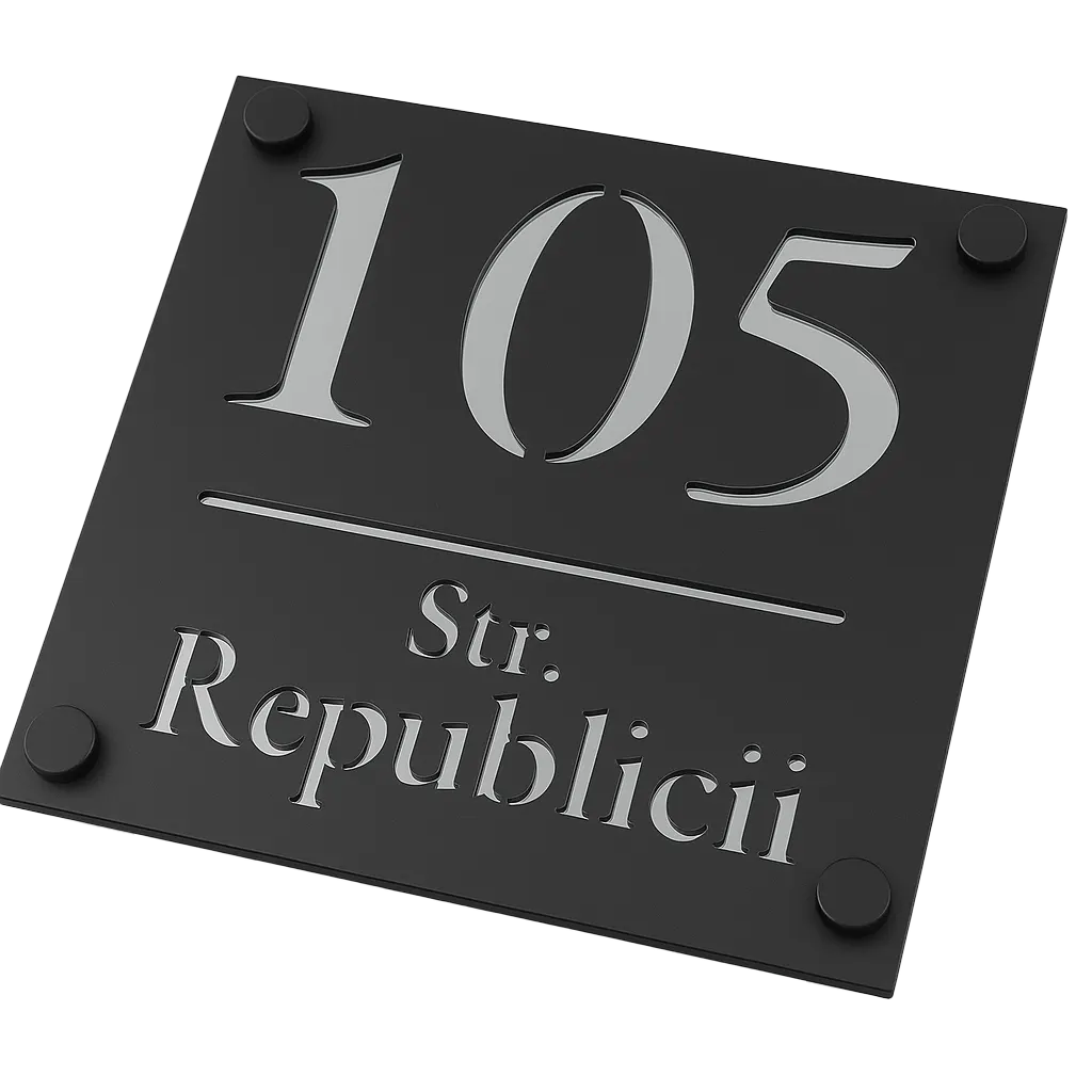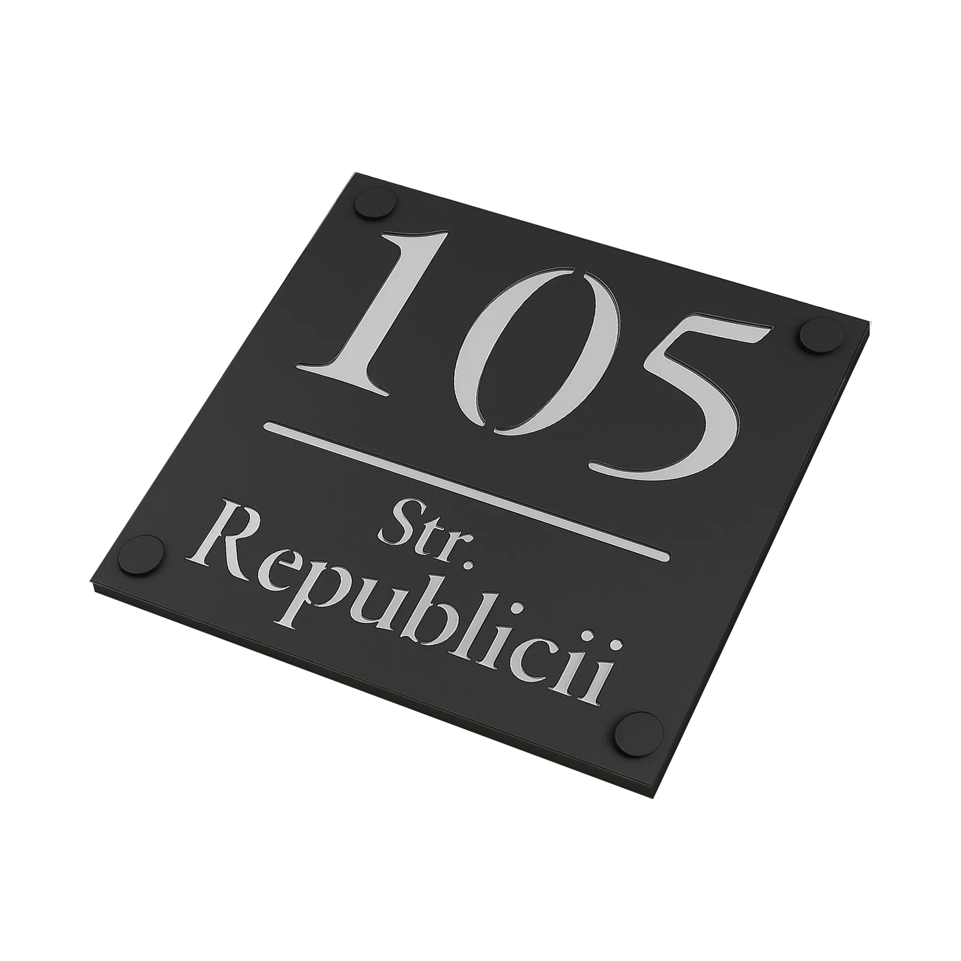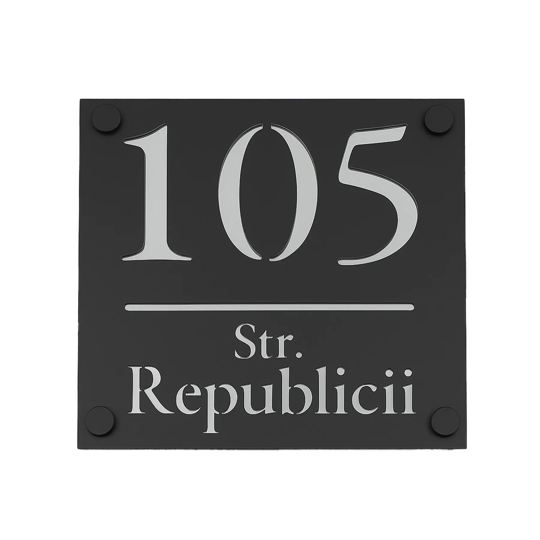 Fabricată din acril rezistent, această plăcuță se remarcă prin contrastul vizual dintre negru și argintiu oglindă. Suprafața argintie reflectă lumina și asigură lizibilitate optimă atât pe timp de zi, cât și pe timp de seară. Stilul sobru și fontul clasic transformă produsul într-un element decorativ de impact, care se potrivește perfect pe fațadele moderne sau tradiționale.