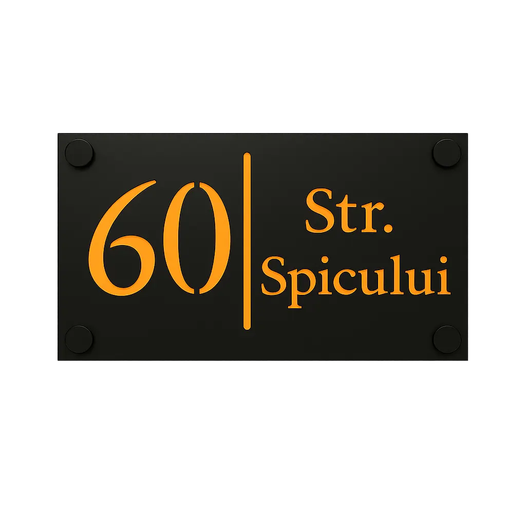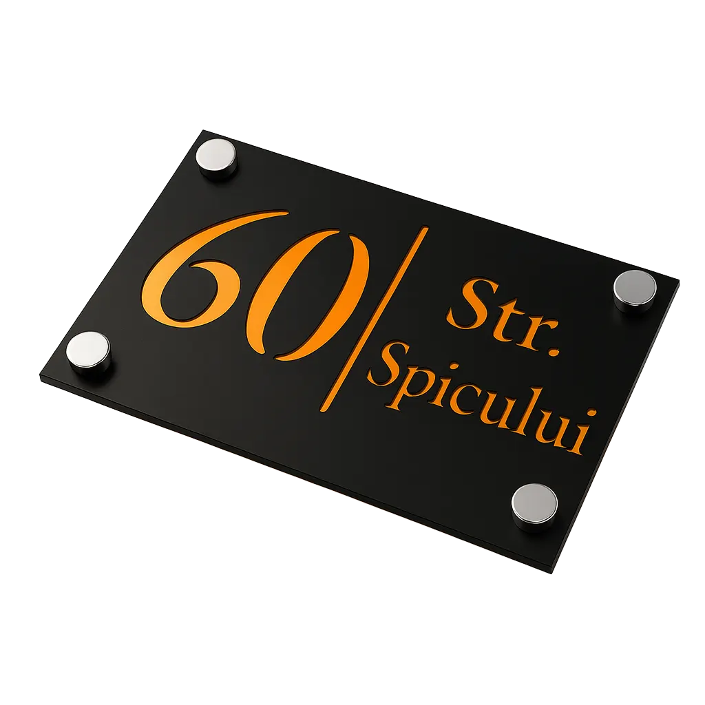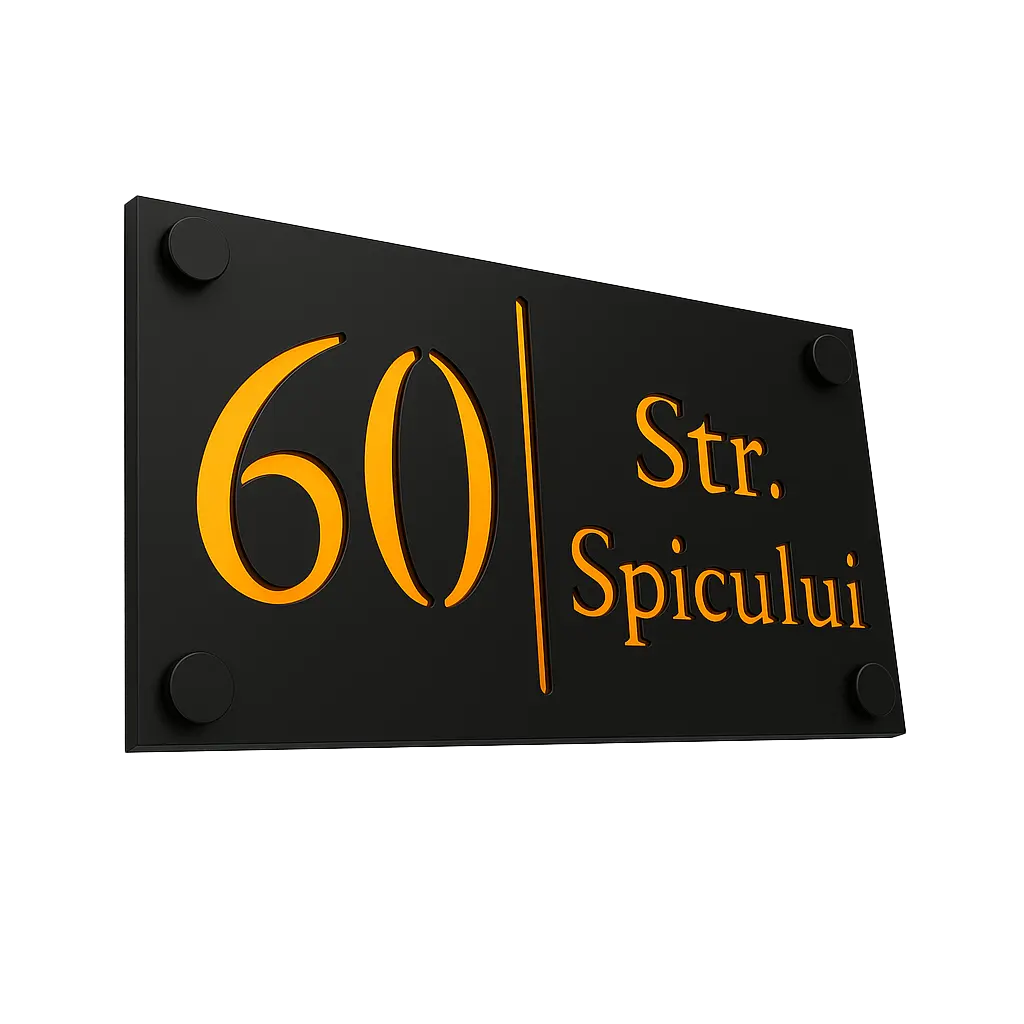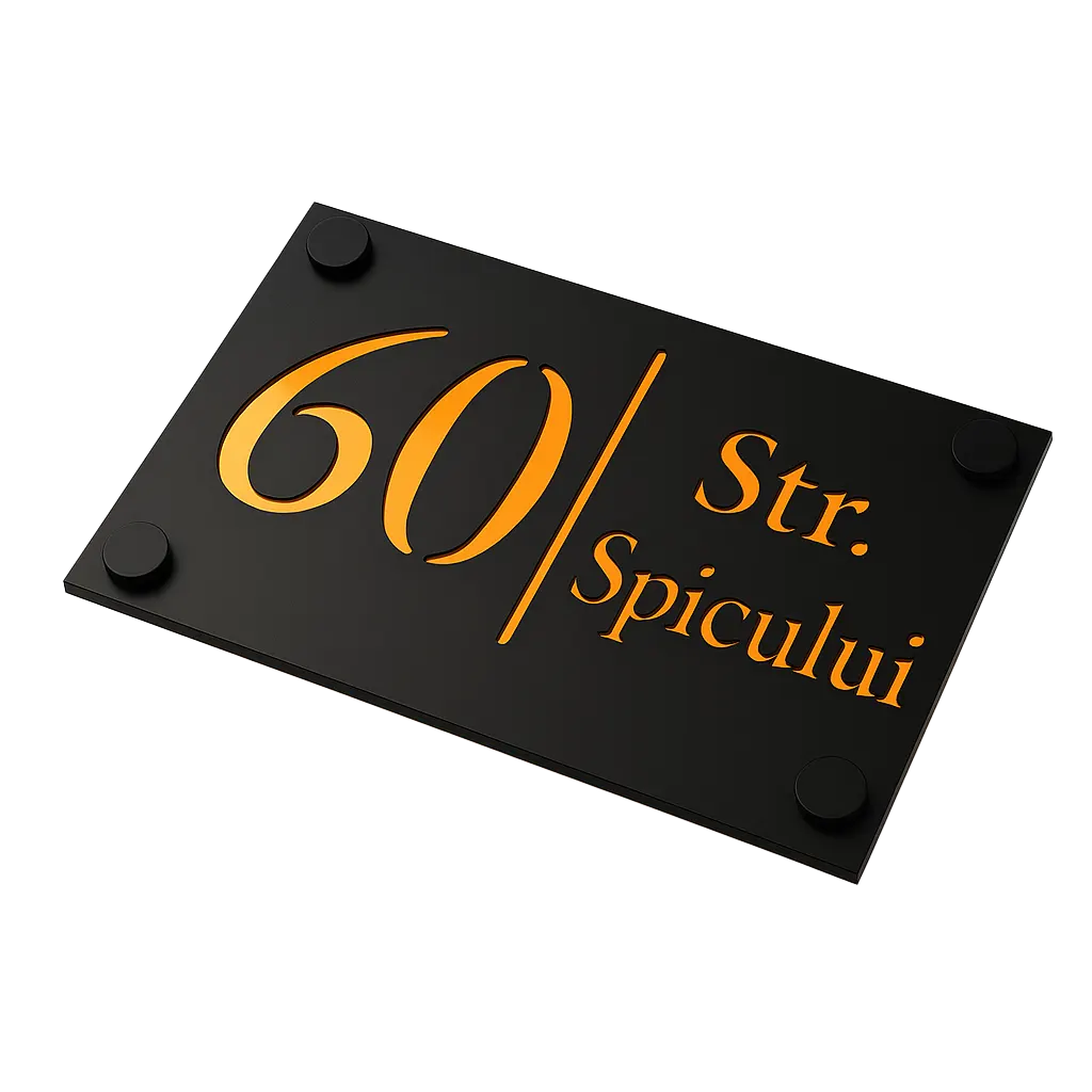 Fabricată din acril rezistent, plăcuța se evidențiază prin contrastul dintre stratul frontal negru și fundalul Amber Oglindă. Nuanța caldă a ambrei adaugă un efect vizual distinctiv, ușor de remarcat chiar și de la distanță, oferind un caracter unic și o notă elegantă locuinței tale. Designul clasic cu linii moderne o transformă într-un element decorativ care depășește rolul funcțional de simplă identificare a adresei.