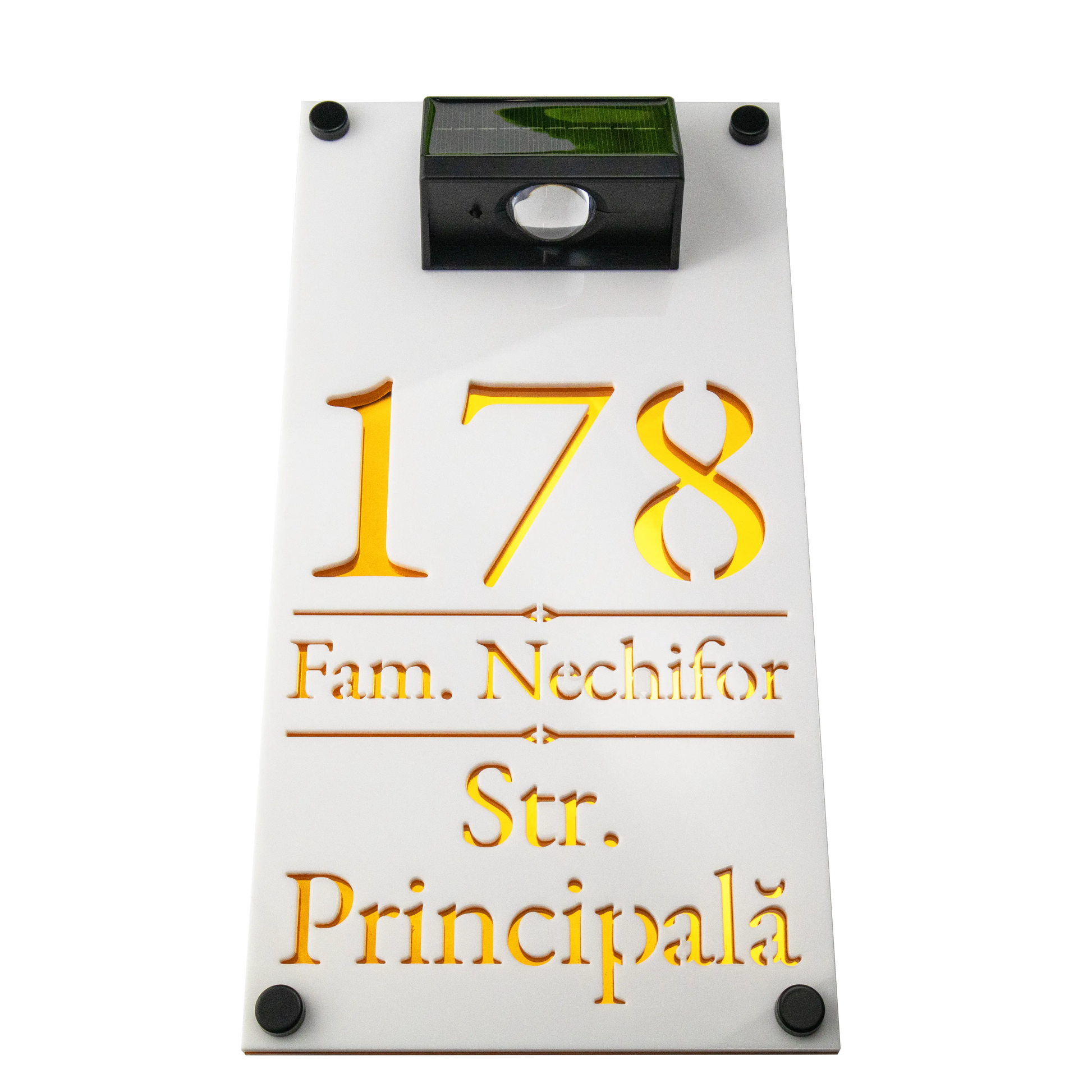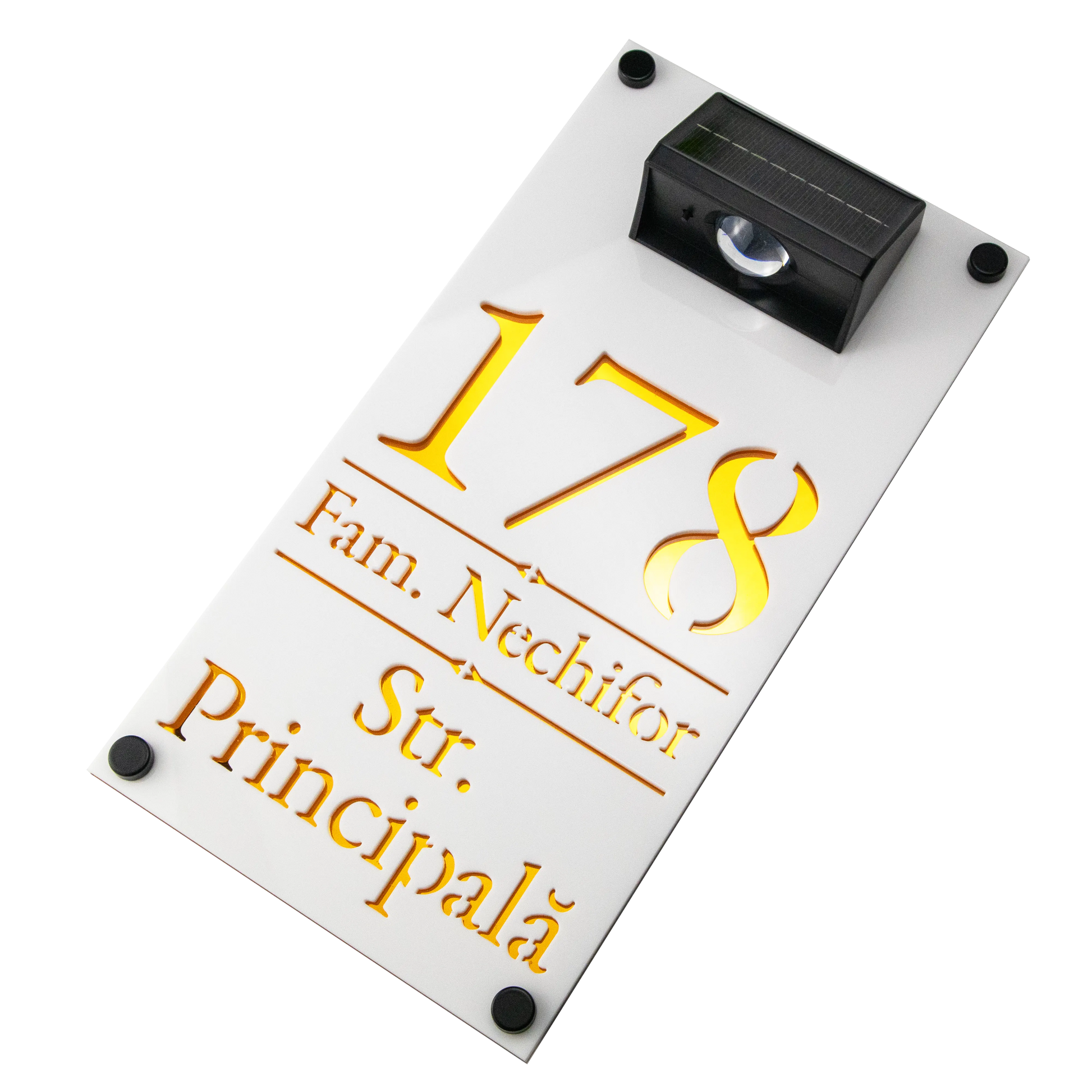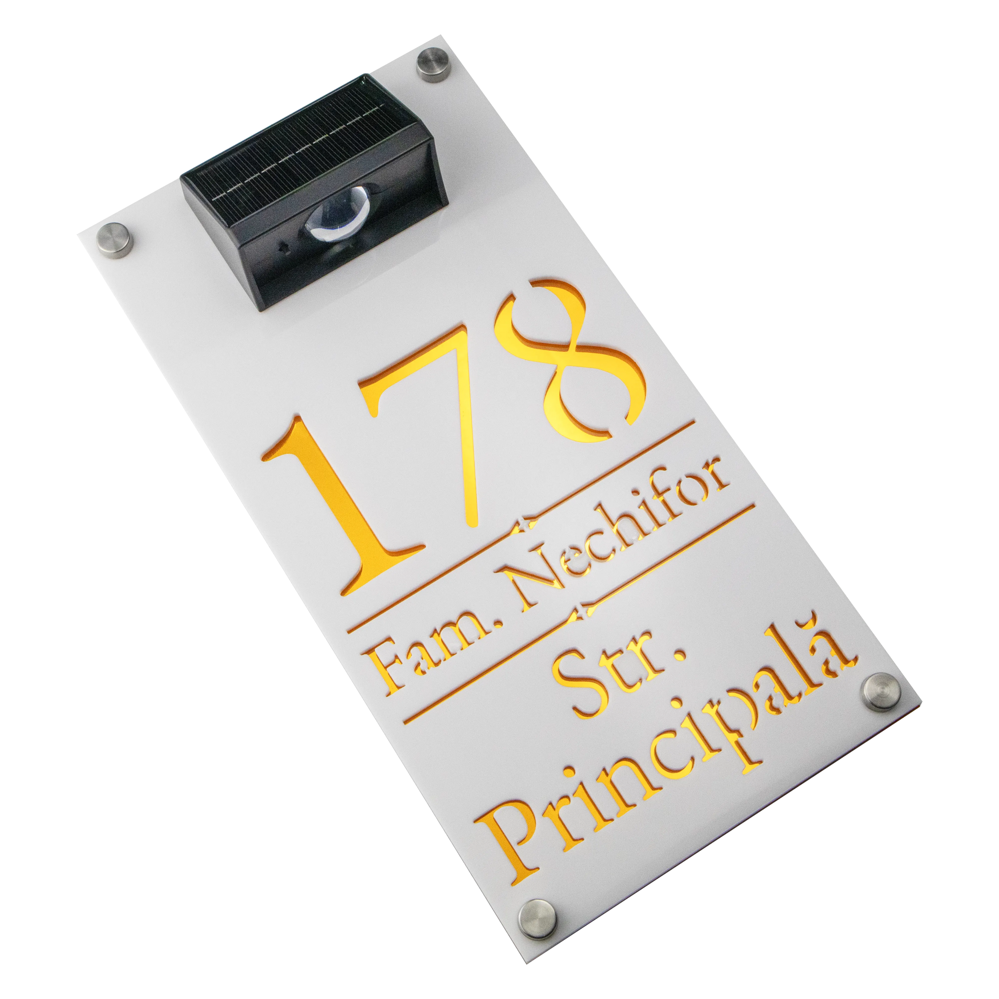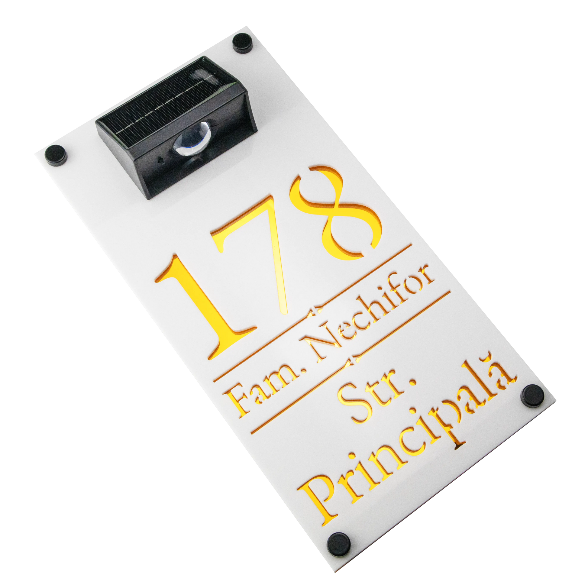Adauga o nota moderna si luminoasa fatadei tale cu Numarul de casa Solar Premium 29x15 – Alb/Amber Oglinda.