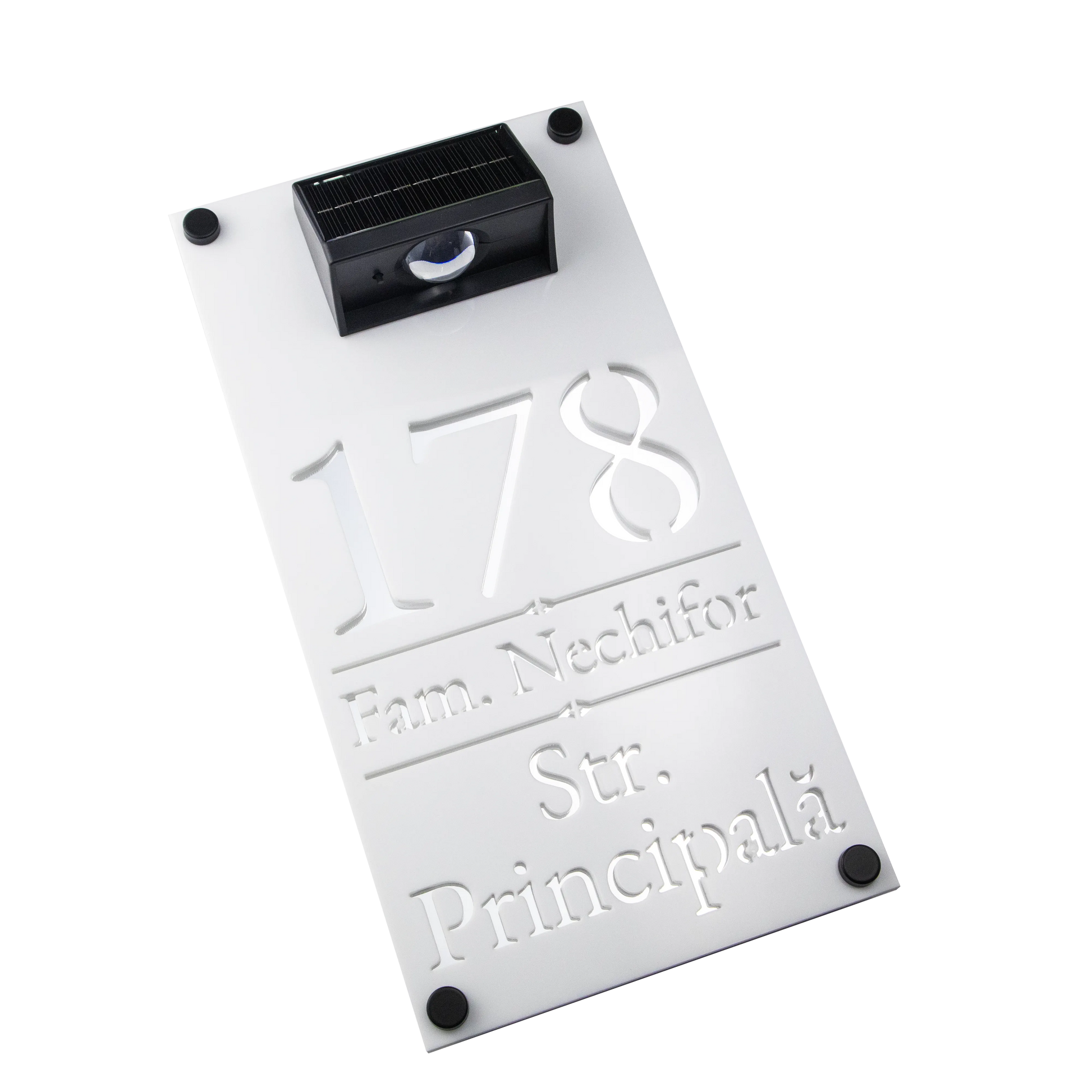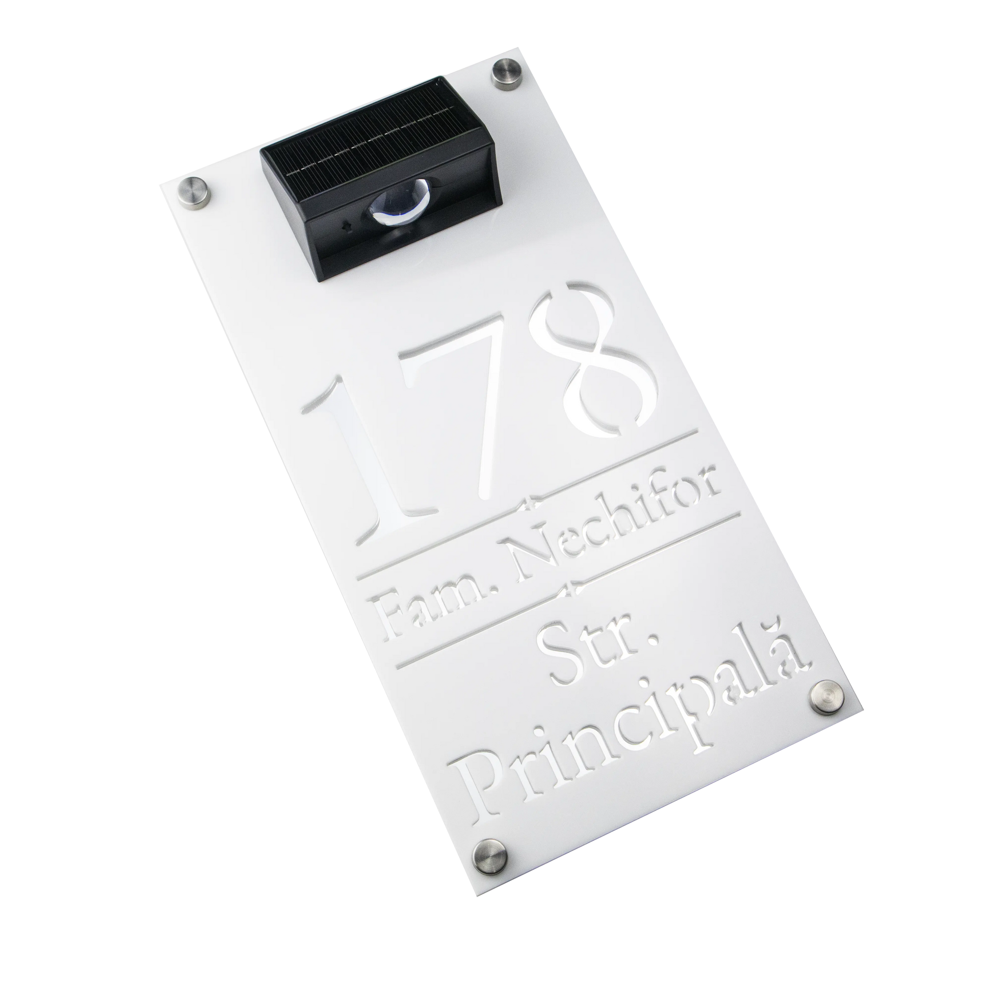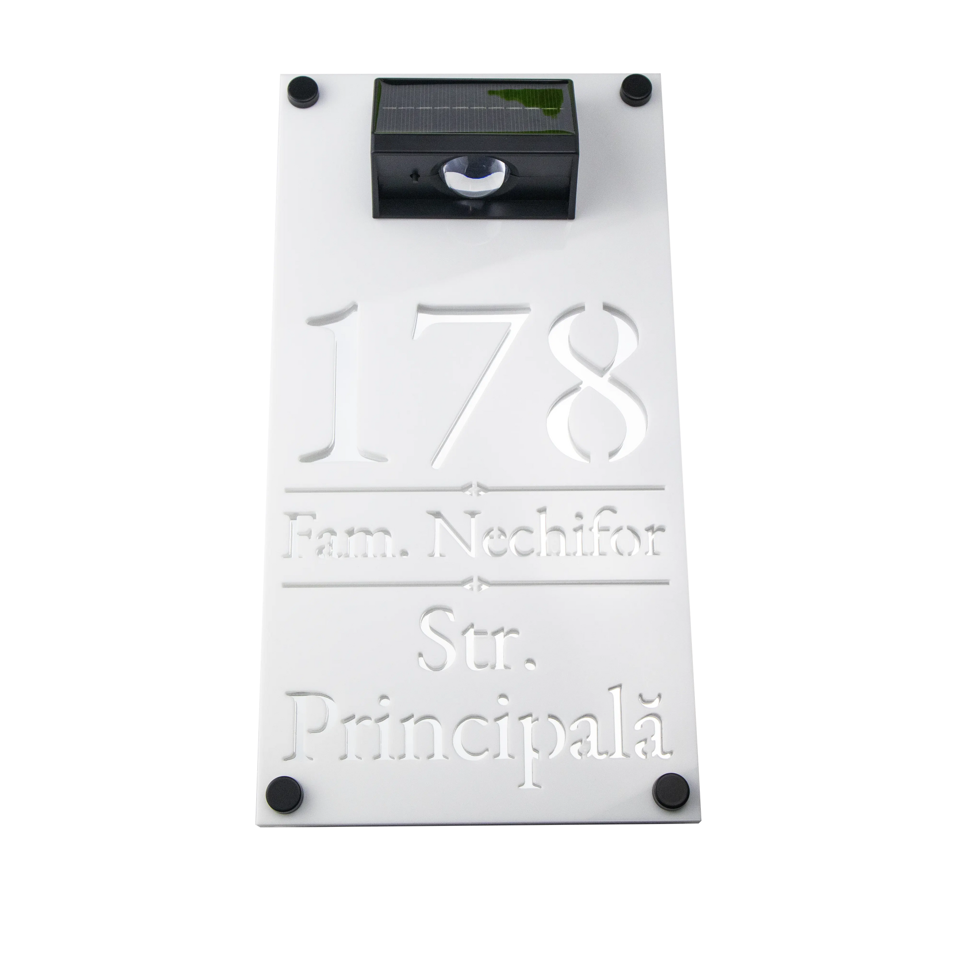 Descopera eleganta moderna a modelului Numar de casa Solar Premium 29x15 – Alb/Argintiu Oglinda.