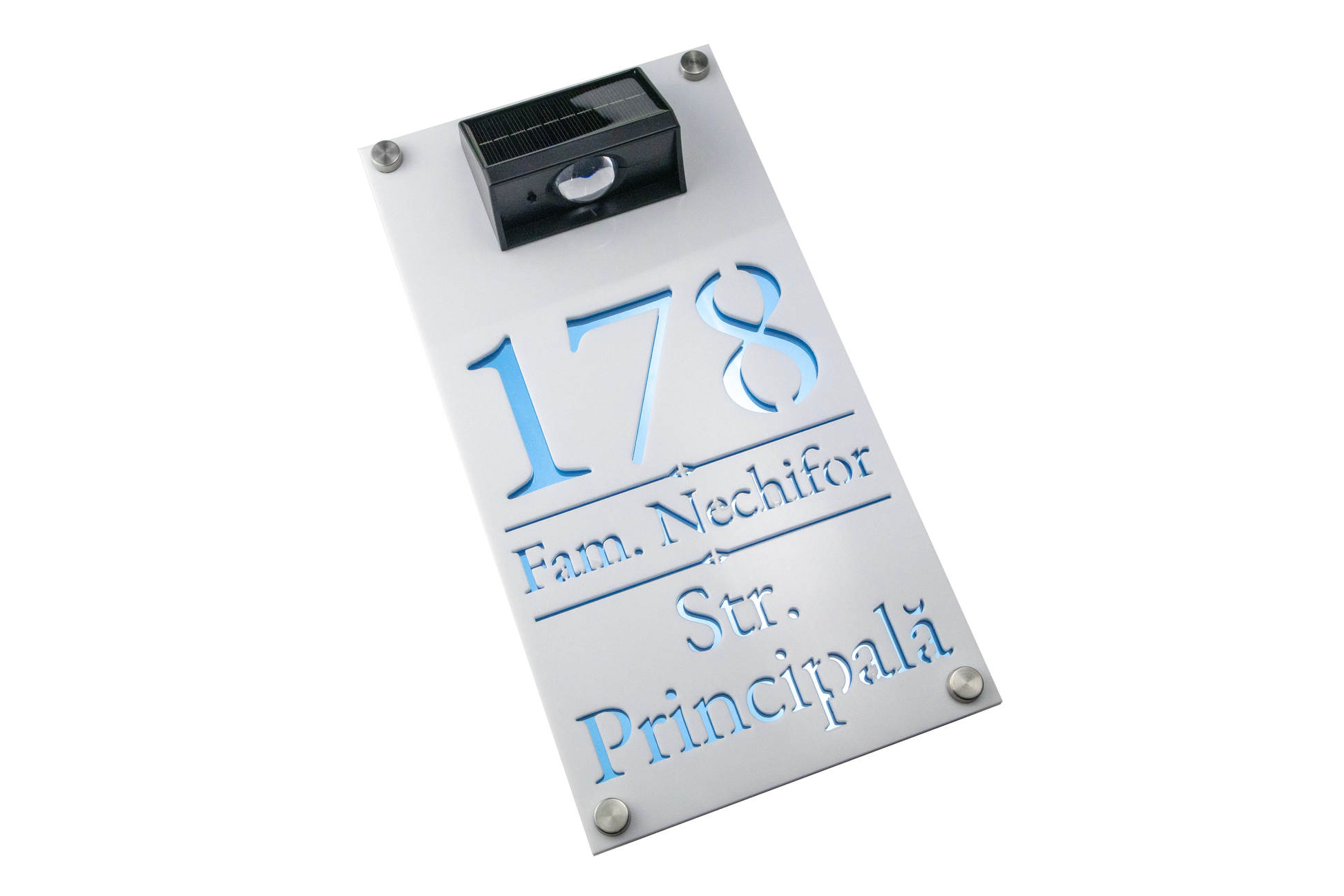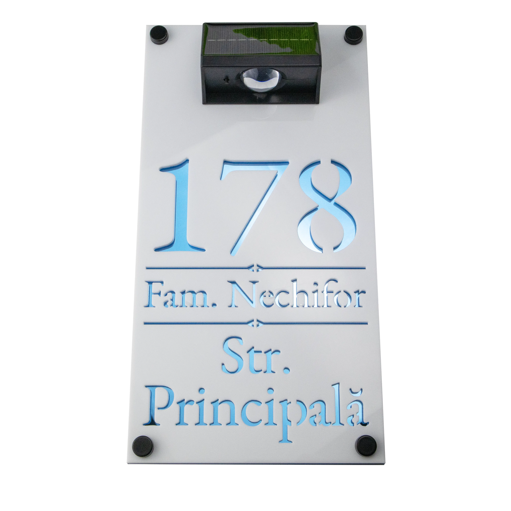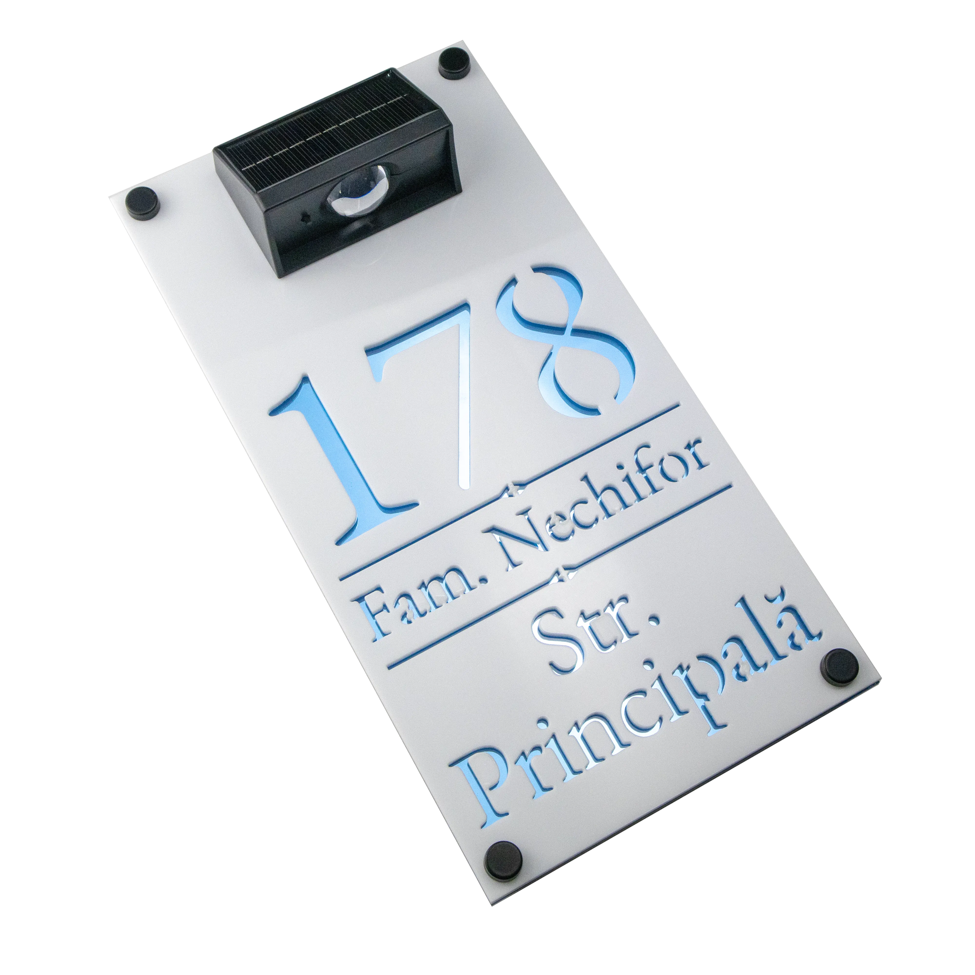Adauga un accent modern si luminos casei tale cu Numarul de casa Solar Premium 29x15 – Alb/Blue Aqua Oglinda.