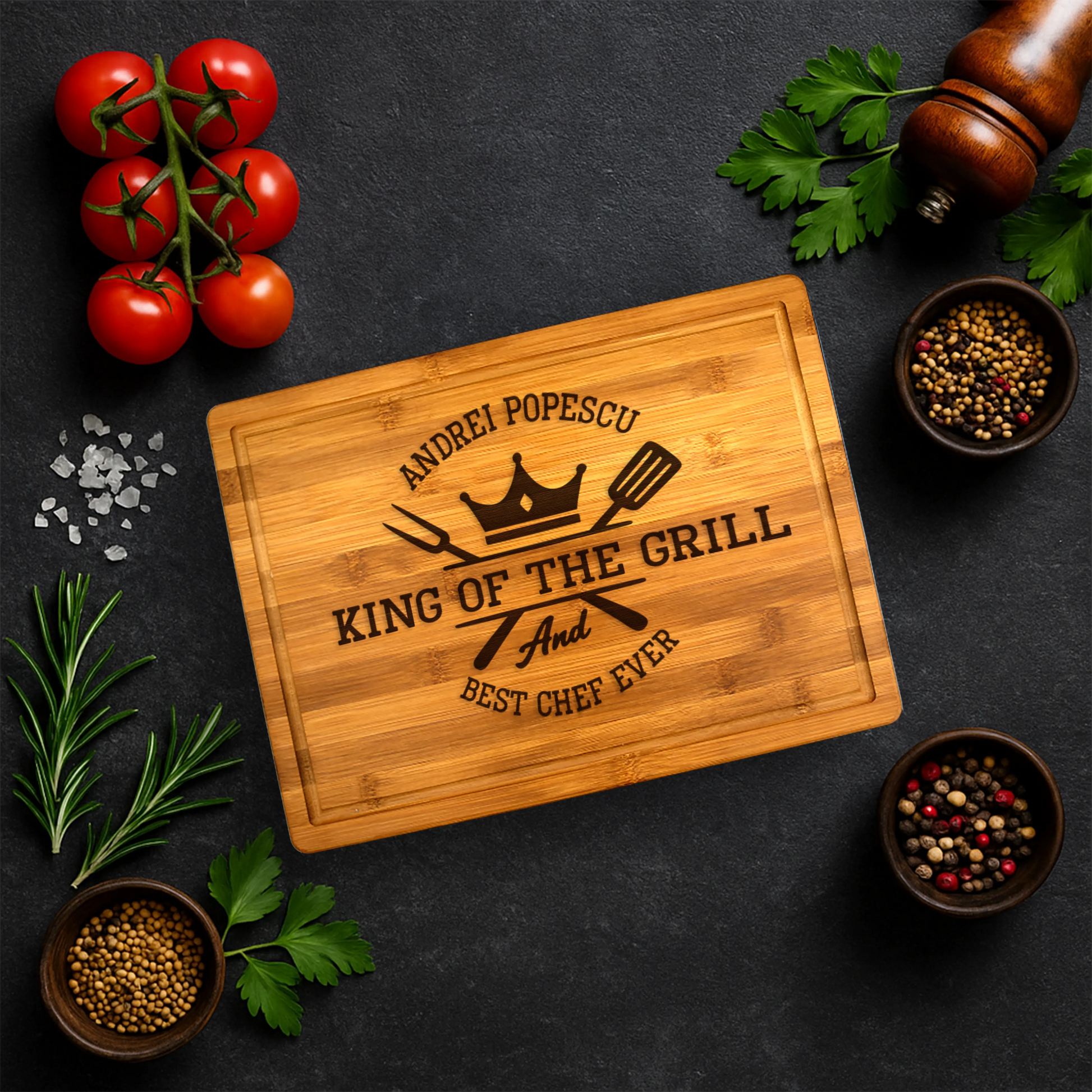 Alege un tocător care îmbină estetica rafinată cu funcționalitatea zilnică. Modelul «King of the grill» este realizat din bambus matur, provenit din surse sustenabile, cunoscut pentru densitatea ridicată și rezistența la umiditate. Fiecare fibră de bambus este presată la temperaturi controlate pentru a crea o suprafață compactă, ideală pentru utilizare intensă. Gravura laser de înaltă precizie transformă placa într-o piesă unică, perfectă atât pentru tocare cât și pentru servire direct pe masă, aducând un plus de autenticitate experienței culinare.