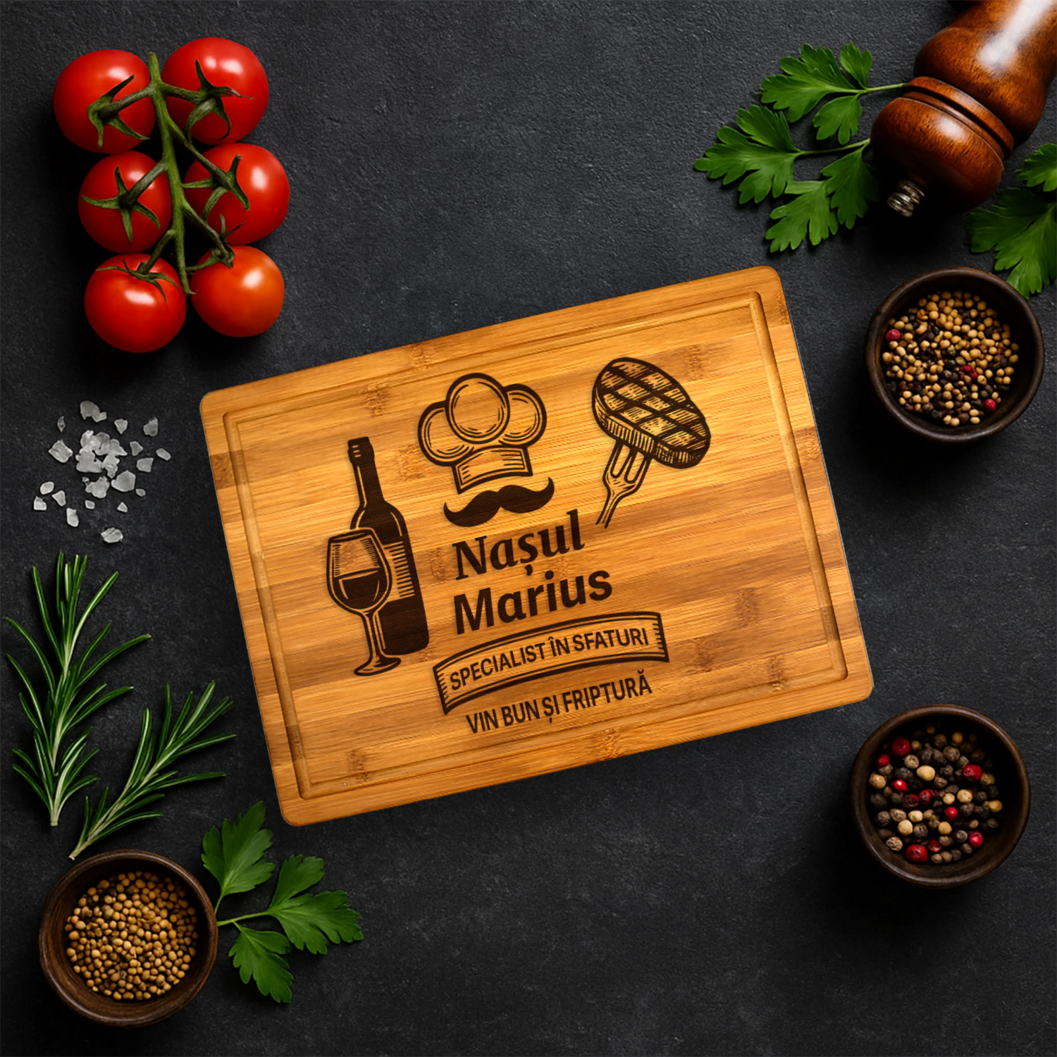Alege un tocător care îmbină estetica rafinată cu funcționalitatea zilnică. Modelul «Nașul specialist» este realizat din bambus matur, provenit din surse sustenabile, cunoscut pentru densitatea ridicată și rezistența la umiditate. Fiecare fibră de bambus este presată la temperaturi controlate pentru a crea o suprafață compactă, ideală pentru utilizare intensă. Gravura laser de înaltă precizie transformă placa într-o piesă unică, perfectă atât pentru tocare cât și pentru servire direct pe masă, aducând un plus de autenticitate experienței culinare.