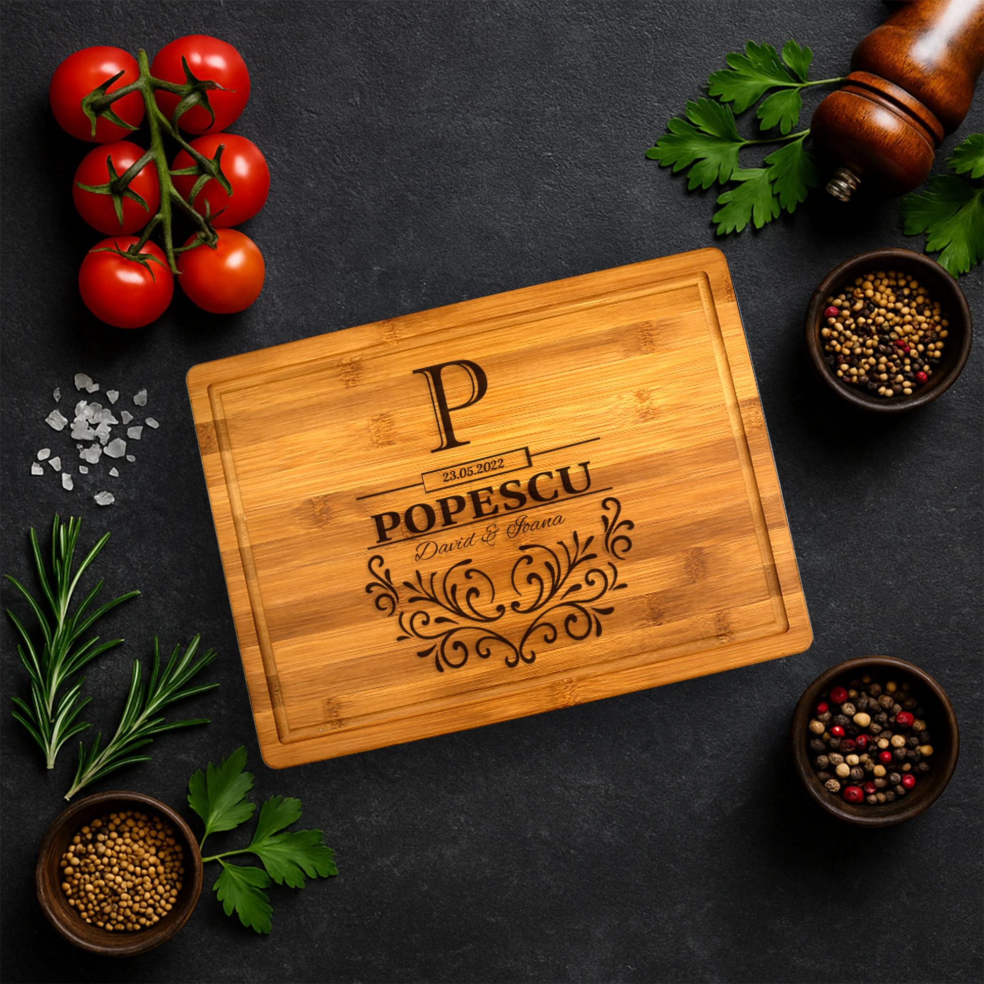 Alege un tocător care îmbină estetica rafinată cu funcționalitatea zilnică. Modelul «Nume cuplu» este realizat din bambus matur, provenit din surse sustenabile, cunoscut pentru densitatea ridicată și rezistența la umiditate. Fiecare fibră de bambus este presată la temperaturi controlate pentru a crea o suprafață compactă, ideală pentru utilizare intensă. Gravura laser de înaltă precizie transformă placa într-o piesă unică, perfectă atât pentru tocare cât și pentru servire direct pe masă, aducând un plus de autenticitate experienței culinare.