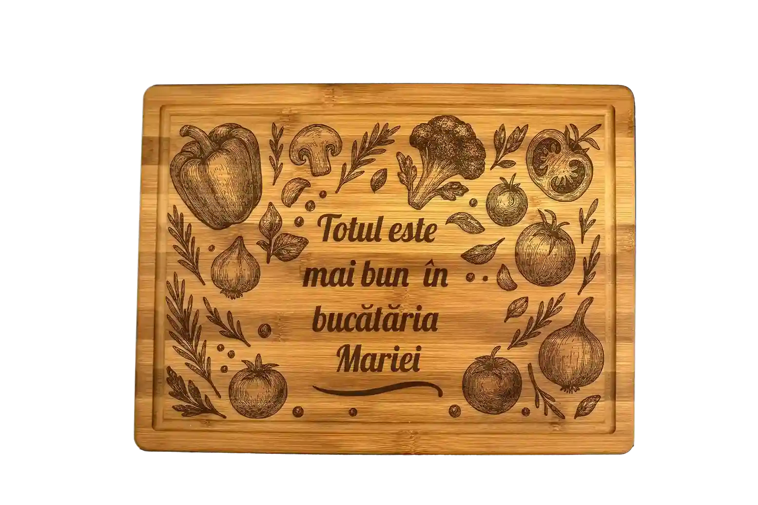 Cu dimensiunile sale generoase de 40 × 28 × 2,4 cm și canalele laterale adânci, tocătorul colectează sucurile rezultate din fructe, legume sau carne, protejând blatul și menținând igiena. Mânerele frezate permit transportul sigur, iar tratamentul cu ulei mineral alimentar asigură o protecție suplimentară împotriva petei și mirosurilor. Comparativ cu tocătoarele din plastic, bambusul nu tocește lama cuțitelor și oferă proprietăți naturale antibacteriene, prelungind durata de viață a ustensilelor tale. În plus, gravura nu se estompează în timp, fiind rezistentă la spălări repetate, ceea ce îl face cadoul perfect pentru nunți, aniversări sau inaugurări de casă.